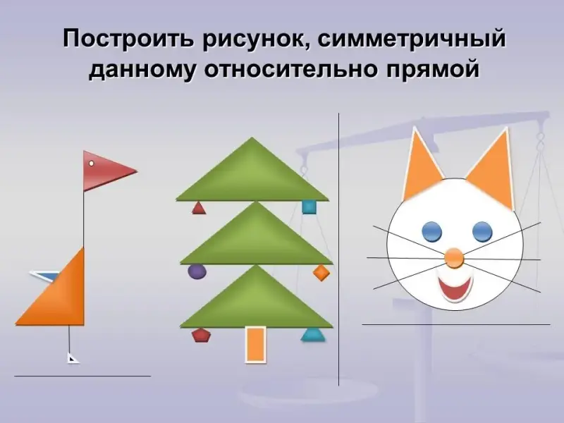 - Повторим построение симметричных точек и геометрических фигур относительно прямой.
