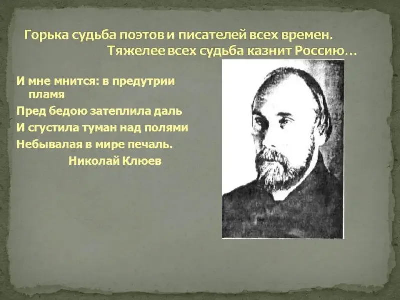2 ведущий: Клюев Николай. Упорное нежелание "певца олонецкой избы" подчиниться "требованиям эпохи" привело к тому, что выразители интересов пролетариата поспешили похоронить его как поэта и объявить творчески несостоятельным. Едва ли не на полстолетия литературное наследие Клюева было выведено из культурного оборота. Для нескольких поколений читателей такого поэта просто не существовало. Вновь печатать его произведения, и то небольшими по тем временам тиражами, начали лишь в 1970-е годы. А реальный масштаб наследия поэта открылся читающей публике в самом конце XX в., когда стали доступны произведения, ранее не печатавшиеся.
