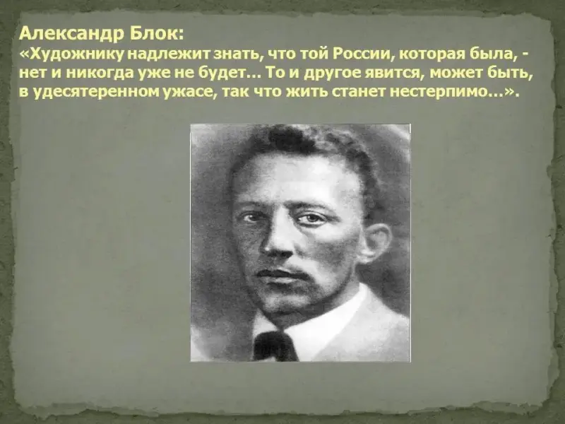 2 ведущий: Александр Блок в анкете записывал: "Художнику надлежит знать, что той России, которая была, -нет и никогда уже не будет... То и другое явится, может быть, в удесятеренном ужасе, так что жить станет нестерпимо...". Поэт понимал, что "музыка революции явно ослабевает, глохнет, что его уровень ожиданий от нее был явно чрезмерен..."