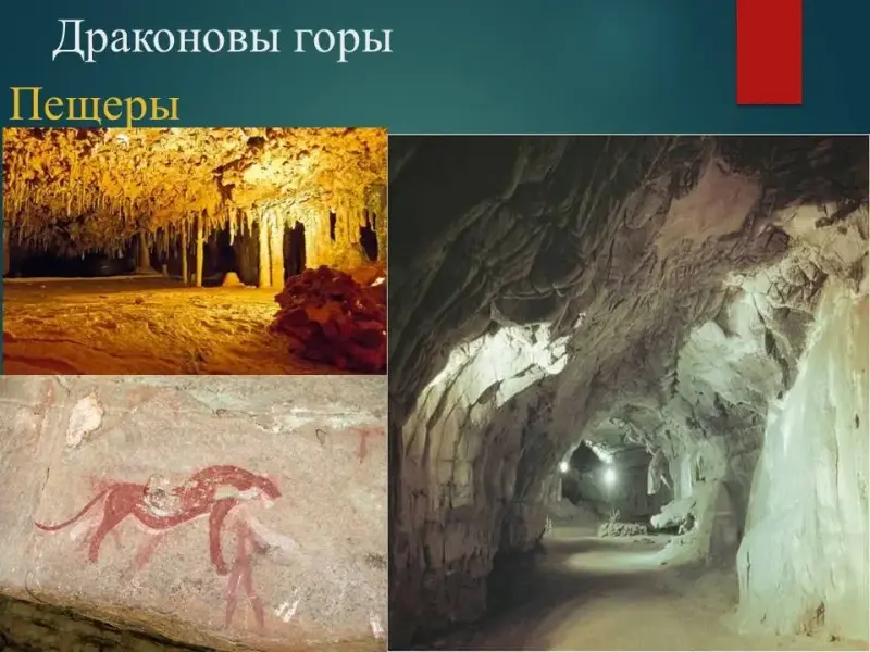 На юго-востоке материка находится скальный массив - Драконовы горы, высшая точка гора Ткабана-Нтленьяна (3482 м.) ( слайд 16). Пещеры Драконовых гор славятся своей наскальной живописью (слайд 17). Ещё одна достопримечательность гор - второй в мире по высоте водопад Тугела (947 м.). Сказочное название гор имеет несколько версий происхождения. Одна из них - якобы местные жители в 19 веке увидели огромного ящера с хвостом и крыльями дракона (слайд 18). Подписать на контурной карте.