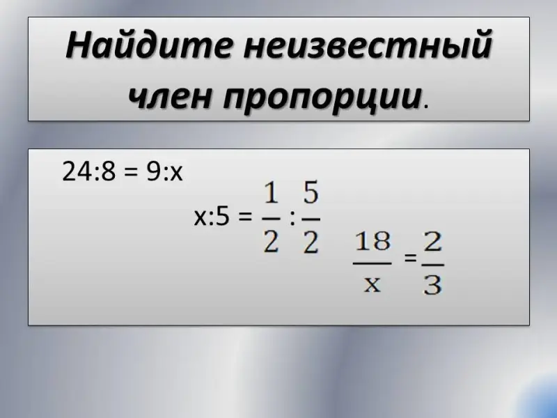 7) Найдите неизвестный член пропорции: 24:8=9:х, х:5=1/2:5/2, 18/х=2/3.
