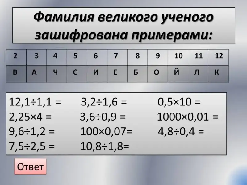| 7,5:2,5 = 3(А) | 3,6:0,9 = 4(Ч) | 100 * 0,07 = 7(Е) |