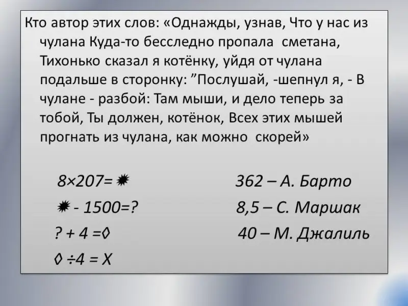 | 12,1:1,1 = 11(Л) | 2,25 * 4 = 9 (О) | 9,6: 1,2 = 8(Б) |