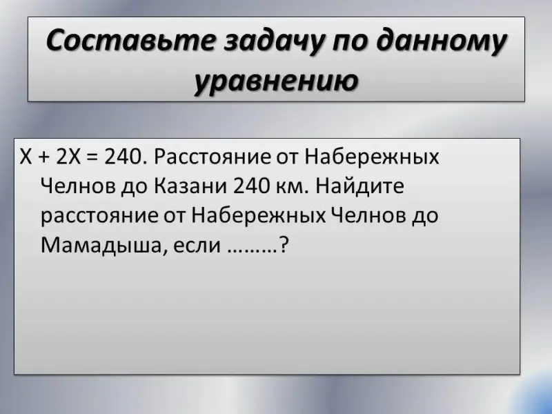 10) Составьте задачу по данному уравнению: x+2x=240.