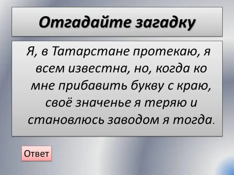 11) Отгадайте загадку: "Я, в Татарстане протекаю, я всем известна, но, когда ко мне прибавить букву с краю, свое значенье я теряю и становлюсь заводом я тогда". (КамАЗ)