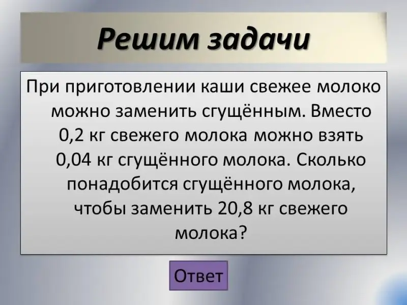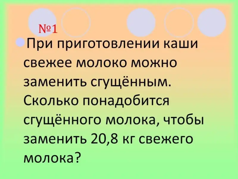 1) При приготовлении каши свежее молоко можно заменить сгущенным. Вместо 0,2 кг свежего молока можно взять 0,04 кг сгущенного молока. Сколько понадобится сгущенного молока, чтобы заменить 20,8 кг свежего молока?