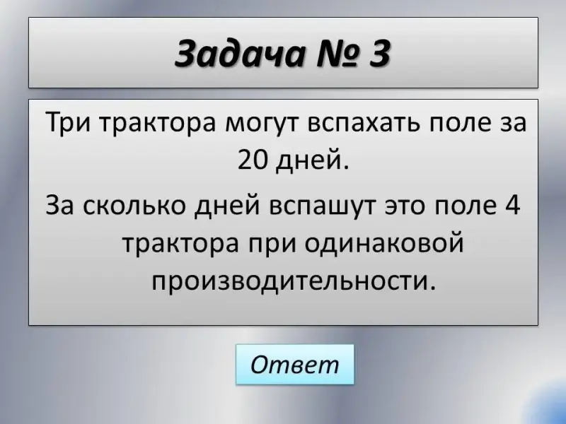 3) Три трактора могут вспахать поле за 20 дней. За сколько дней вспашут это поле 4 трактора при одинаковой производительности?