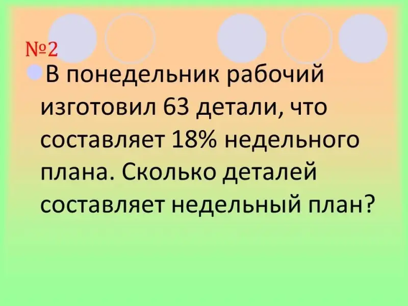 2) В понедельник рабочий изготовил 63 детали, что составляет 18% недельного плана. Сколько деталей составляет недельный план?