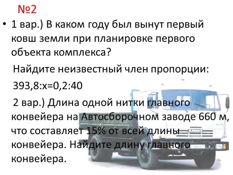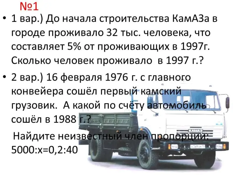 16 февраля 1976 г. с главного конвейера сошел первый камский грузовик. А какой по счету автомобиль сошел в 1988 г.? Найдите неизвестный член пропорции: 5000:Х=0,2:40