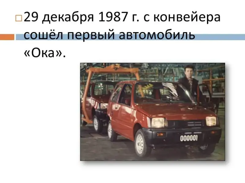 29 декабря 1987 г с конвейера сошел первый автомобиль "Ока".