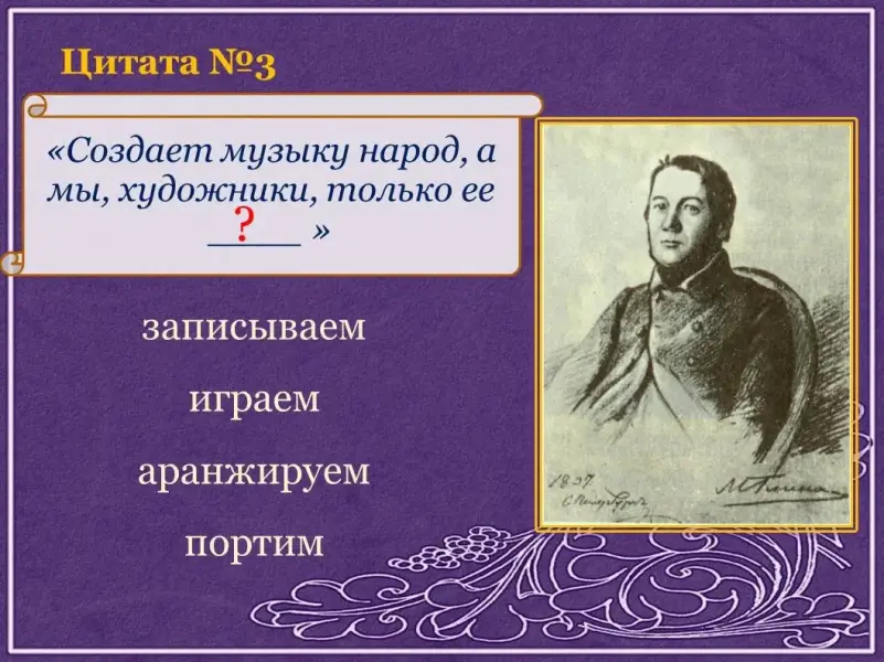 Звучат аудио и видеофрагменты произведений Глинки. Нужно узнать сочинение и дать полный правильный ответ.