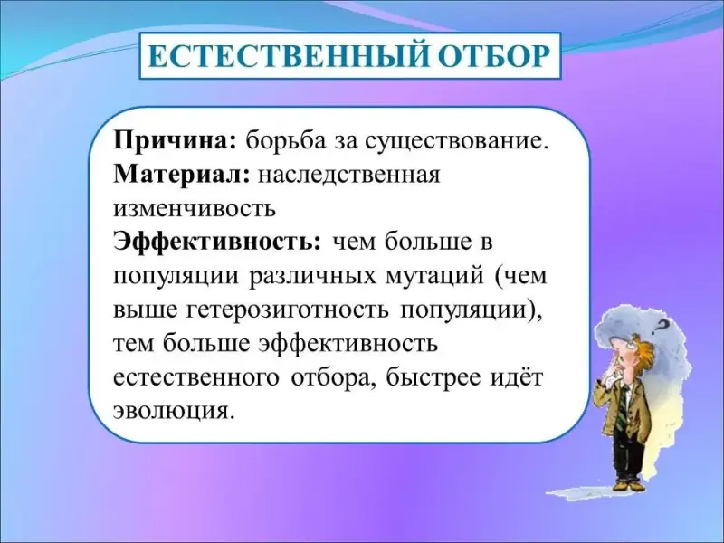 (слайд № 10). Естественный отбор - это процесс, в результате которого преимущественно выживают и оставляют потомство наиболее приспособленные особи каждого вида и погибают менее приспособленные. Приведём характеристики отбора: (слайд № 11-12). |