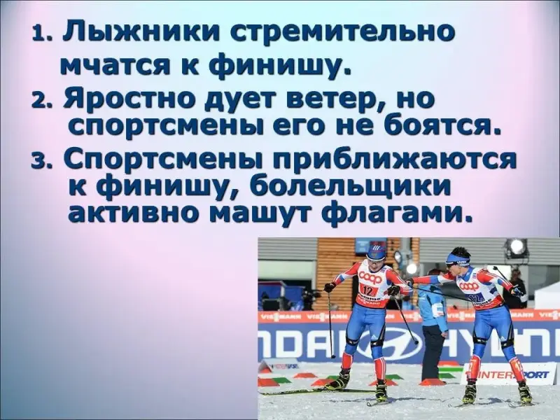 б) вариативная (по выбору): составить 2 сложных предложения (о представителе зимнего вида спорта) и построить их схемы. Придумать кроссворд (8-10 слов) о зимних видах спорта.