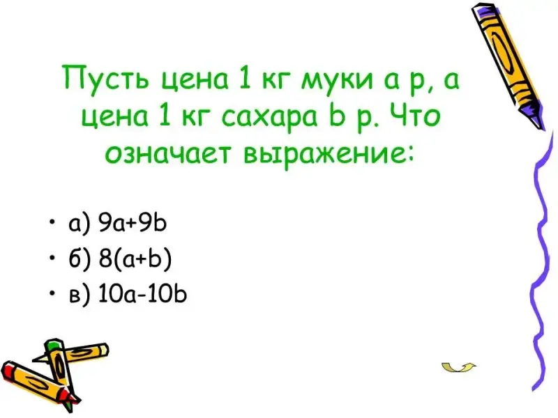 Пусть цена 1 кг муки a р, а цена 1 кг сахара b р. Что означает выражение: