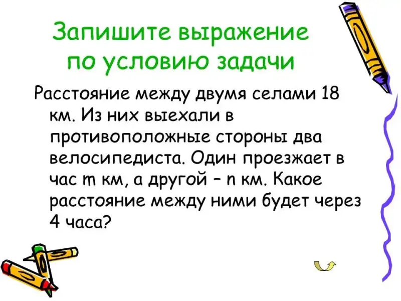 Расстояние между двумя селами 18 км. Из них одновременно выехали в противоположные стороны два велосипедиста. Один проезжает в час m км, а другой - n км. Какое расстояние будет между ними через 4 часа?