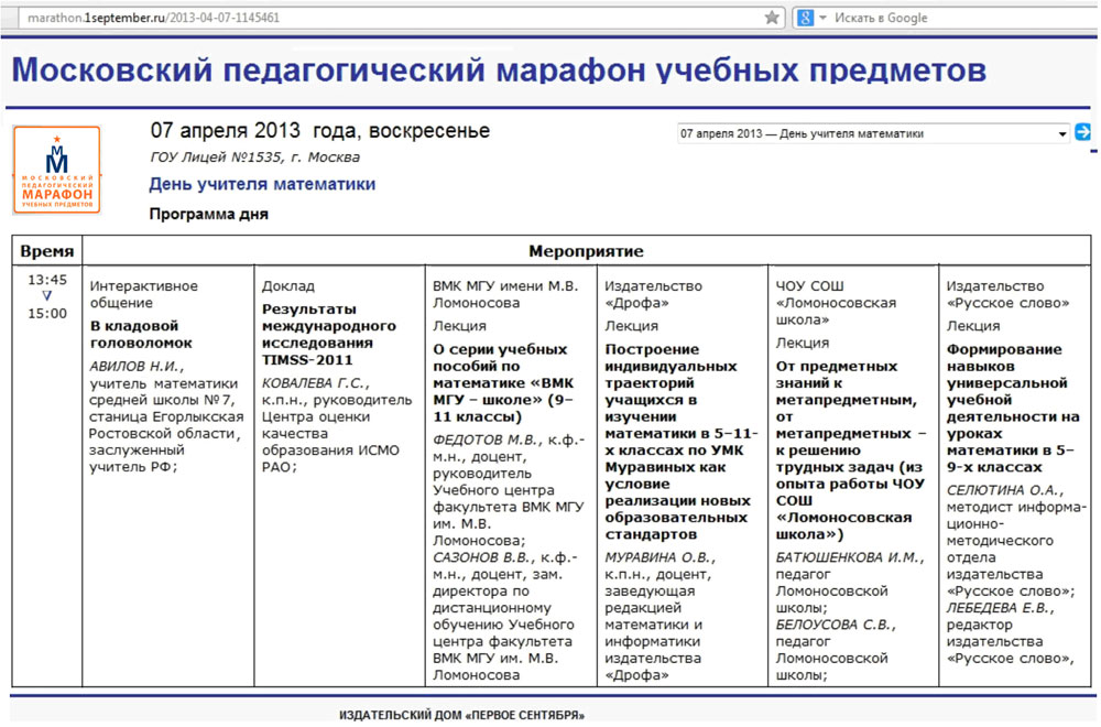 Московский лицей №1535, в котором проводился Московский педагогический марафон учебных предметов, расположен рядом со станцией метро "Спортивная". Идти от станции метро к лицею недалеко, по пути заметил движущиеся со мной в одном направлении разговорчивые группы прохожих, подумал, что это школьные учителя. Так и оказалось, это московские учителя спешили на "Марафон". Ведь сегодня, 7 апреля 2013 года, День математики. Когда мы вошли в лицейский двор, я был удивлен. Последний раз такие громадные очереди я видел ещё в Советском Союзе, например, к Мавзолею В.И. Ленина.
