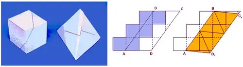 Задачи на разрезание являются увлекательными геометрическими головоломками, они весьма разнообразны, достаточно трудны и очень красивы. Придумано много головоломок на разрезание, познакомимся с новой головоломкой этого класса, которую придумал А.М. Домашенко из Новошахтинска Ростовской области. Ему удалось разрезать одну из разверток куба всего лишь на две части, из которых затем без пропусков и наложений можно сложить модель правильного тетраэдра. На фото показаны куб и тетраэдр, каждый из которых сложен из двух попарно равных многоугольников. Рядом показано, как ступенчатую развертку куба разрезать по прямой АВ и получить параллелограмм, которым можно обернуть правильный тетраэдр.