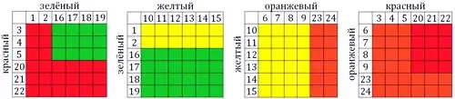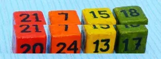 Вот так расставляются натуральные числа от 1 до 24 на гранях четырех кубиков. На красном кубике: 3, 4, 5, 20, 21, 22; на зеленом кубике: 1, 2, 16, 17, 18, 19; на жёлтом кубике: 10, 11, 12, 13, 14, 15; на оранжевом кубике: 6, 7, 8, 9, 23, 24. Взглянув на приведенные таблицы, можно легко сравнить вероятность выигрыша в каждой паре кубиков и ранжировать кубики по замкнутому циклу: красный кубик > зеленый кубик > желтый кубик > оранжевый кубик > красный кубик.