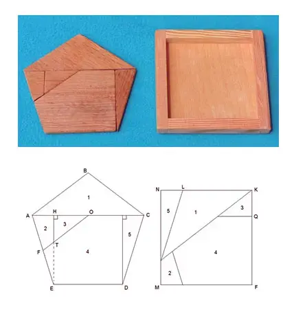Эту головоломку на разрезание придумал Г.И. Ярковой из г. Тольятти. Он не является профессиональным математиком, как говорят, любитель занимательной математики. Его хобби - придумывать и мастерить новые головоломки. Кроме этого он и любит их решать. Достаточно сказать, что Геннадий Иванович является трехкратным чемпион России в заочном первенстве по решению головоломок. В этой его головоломке правильный пятиугольник разрезан на пять частей, которые предлагается вложит в квадратную рамку подходящих размеров.