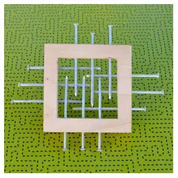 Конечно, эту головоломку можно решать на бумаге с карандашом в руках, но лучше сделать реальную игрушку. Для этого из доски выпилите квадратную рамку, по бокам которой просверлите по три параллельных отверстия для гвоздей. Диаметр сверла подберите таким, чтобы гвозди в отверстии перемещались с небольшим усилием. Осталось гвозди вставить в отверстия рамки и можно "забивать".