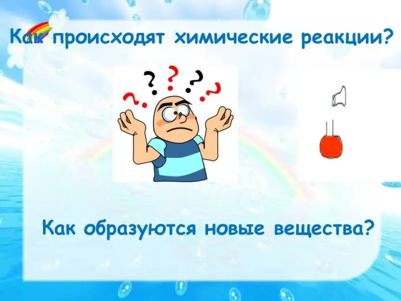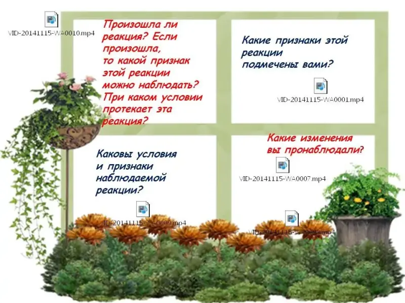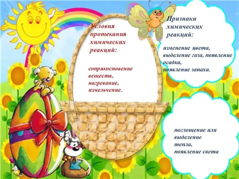 Подытоживаются ответы учащихся: внешними признаками протекания реакции в ходе опыта являются изменение цвета, появление осадка, выделение газа, появление запаха, света и выделение тепла. В качестве условий протекания реакций можно отметить соприкосновение веществ, их трение друг с другом и нагревание.
