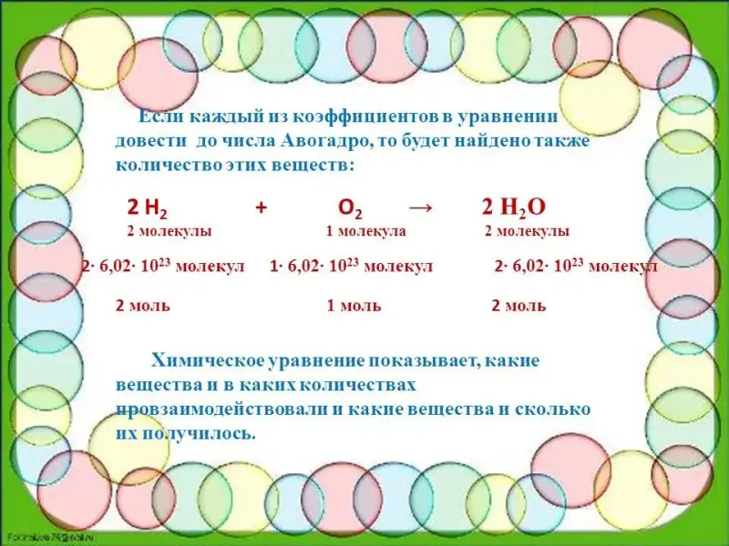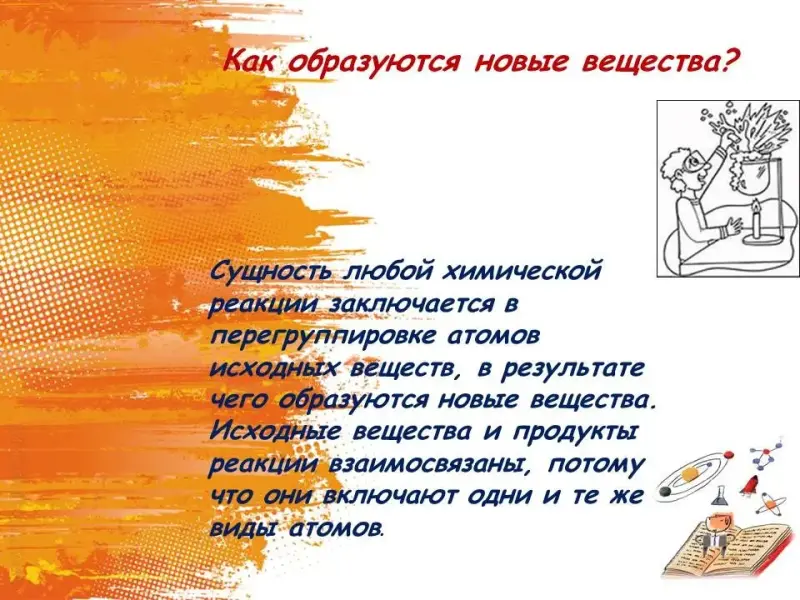 Важно подвести учащихся к выводу о том, что многие физические, химические явления, происходящие с веществами, могут быть объяснены на основе атомно-молекулярного учения. Сущность химических превращений заключается в образовании новых веществ из атомов, составляющих ранее исходные вещества. Запись химической реакции с помощью формул называется уравнением химической реакции. Оно показывает, какие вещества и в каких количествах провзаимодействовали и какие вещества и сколько их получилось. Обратите внимание на числа, стоящие перед формулами веществ в уравнении реакции; они называются коэффициентами
