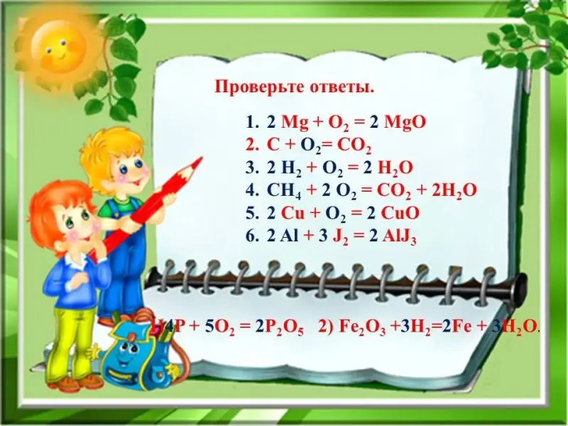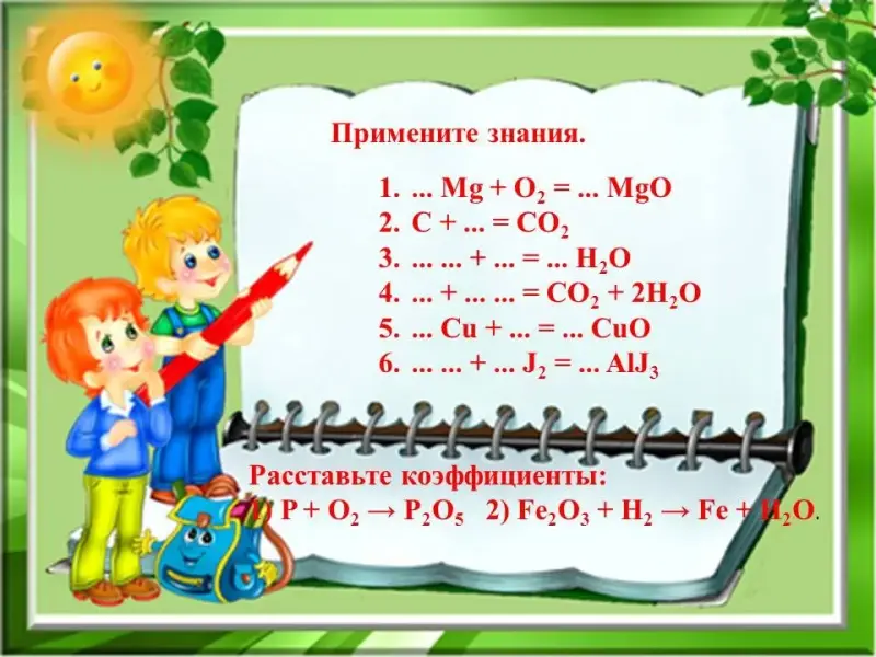 | 1) ... Mg + O2 = ... MgO | 3) ... Cu + ... = ... CuO |