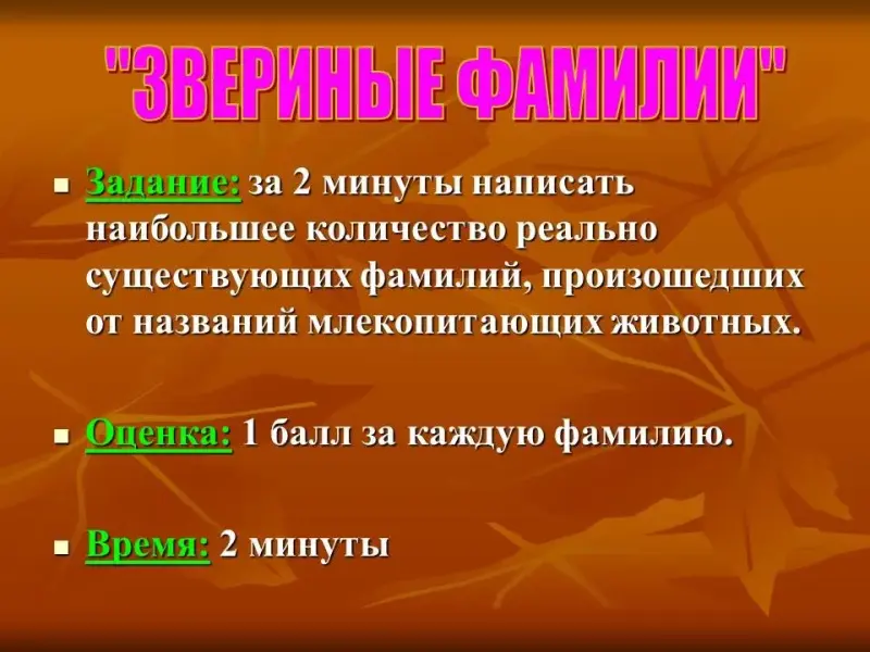 Задание: за 2 минуты написать наибольшее количество реально существующих фамилий, произошедших от названий млекопитающих животных.