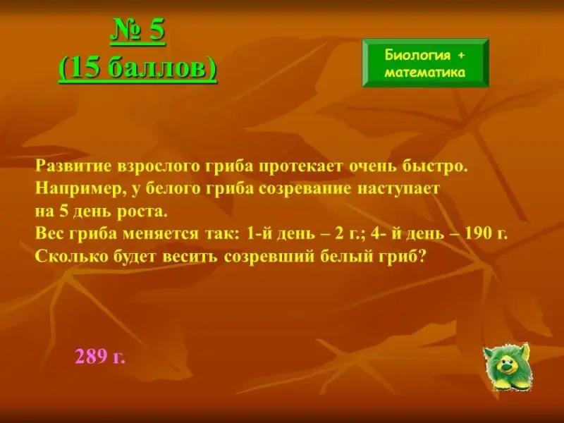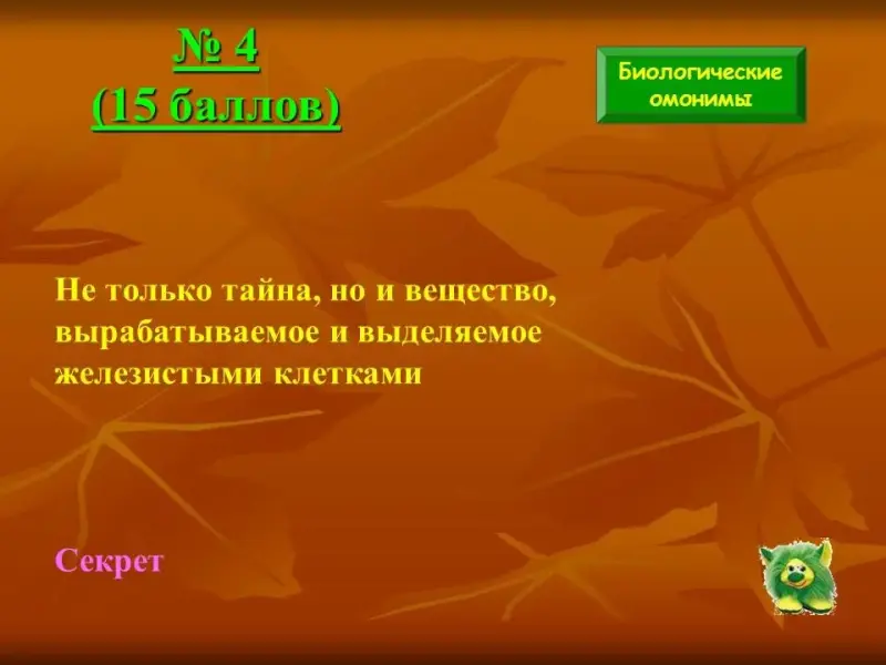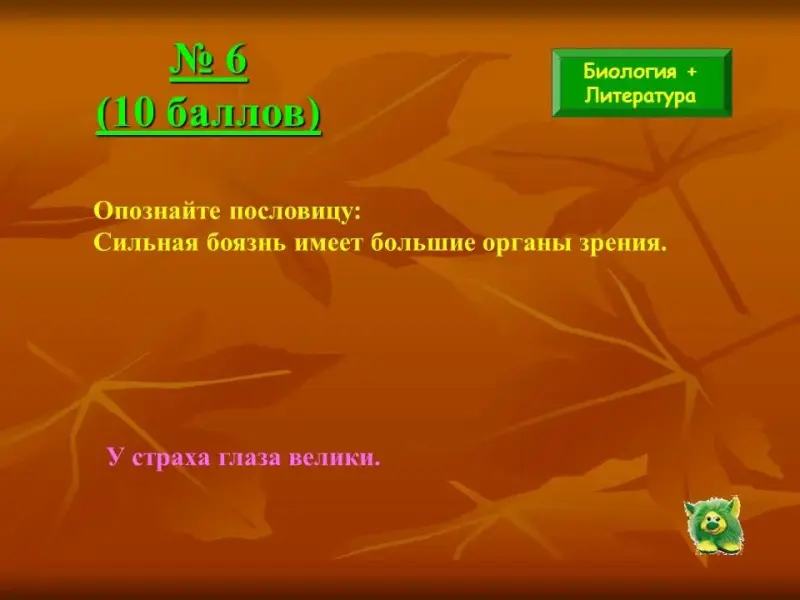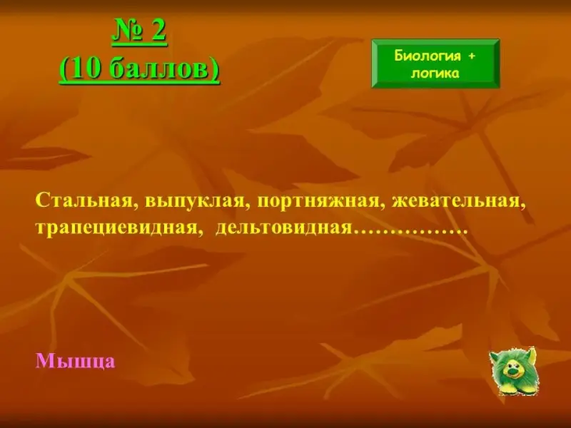 Задание: команды по очереди выбирают номера вопросов (Приложение 6) и отвечают на вопросы под этими номерами. Если команда даёт неверный ответ, другие команды могут дать свой вариант ответа, и, если он правильный, заработать дополнительные баллы.