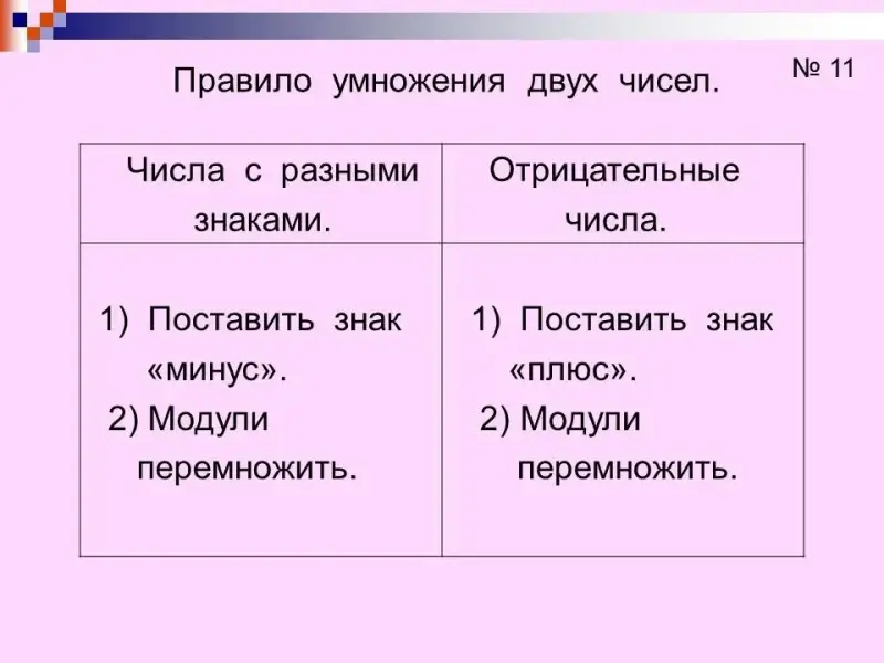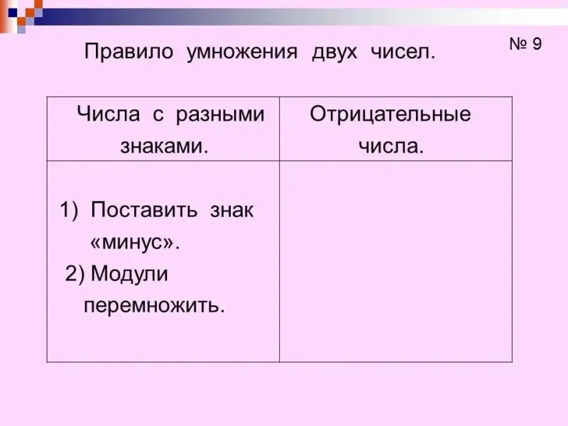 Правило умножения отрицательных чисел и чисел с разными знаками.