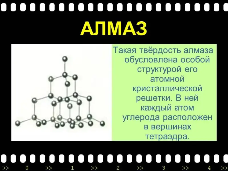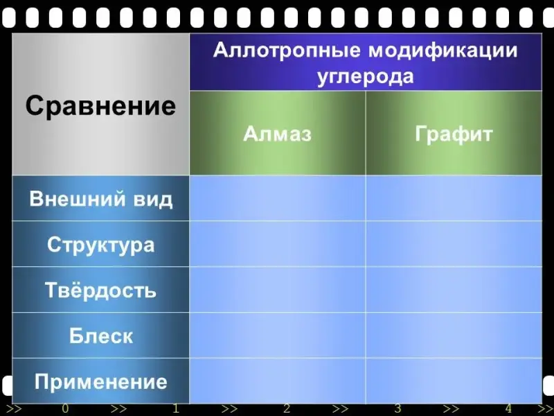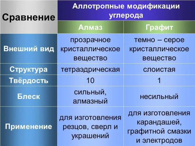 | 6. | Знакомство с аллотропными модификациями углерода при помощи презентации (слайды 10 - 18), затем учащиеся самостоятельно заполняют таблицу в индивидуальных картах. | Работают с презентацией и индивидуальными картами. |