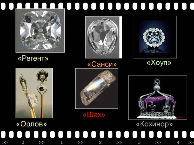 | 14. | Учитель предлагает еще раз посмотреть на самые известные алмазы. Обращается к учащимся с просьбой выбрать, какой камень тебе больше всего понравился? Познакомься с историей этого алмаза. Укажи, что тебя больше всего поразило. | Рассматривают фото алмазов. Работают с индивидуальной картой урока. |