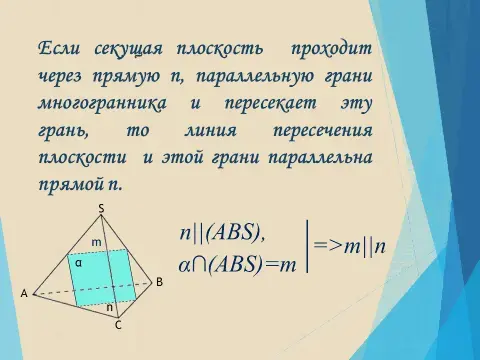 3) Если секущая плоскость a проходит через прямую n, параллельную грани многогранника и пересекает эту грань, то линия пересечения плоскости a и этой грани параллельна прямой n.