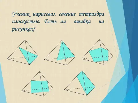 - Как вы думаете, какие фигуры могут оказаться сечением тетраэдра? Параллелепипеда? От чего это зависит?