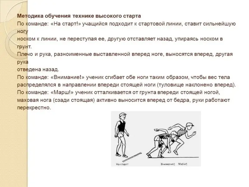 "Внимание!" - учащиеся должны прийти в положение, которое обеспечило бы ему хорошее равновесие и создало бы условия для начала бега. Тяжесть тела переносится на руки и переднюю ногу. Маховая нога не испытывает большой нагрузки тяжести тела. Таз поднимается несколько выше плеч, линии спины направлена вперед вниз к плечам.