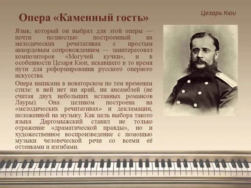 В течение долгих лет имя композитора связывалось исключительно с оперой "Каменный гость" как с произведением, оказавшим большое влияние на развитие русской оперы. Опера написана в новаторском по тем временам стиле: в ней нет ни арий, ни ансамблей (не считая двух небольших вставных романсов Лауры). Она целиком построена на "мелодических речитативах" и декламации, положенной на музыку. Как цель выбора такого языка Даргомыжский ставил не только отражение "драматической правды", но и художественное воспроизведение с помощью музыки человеческой речи со всеми её оттенками и изгибами. Позднее принципы оперного искусства Даргомыжского были воплощены в операх М. П. Мусоргского - "Борисе Годунове" и особенно ярко в "Хованщине".