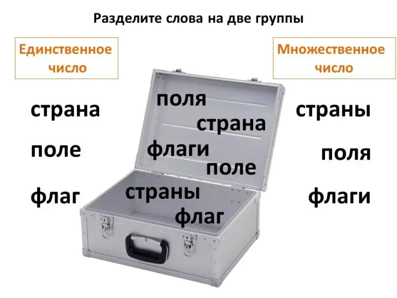 - Прочитайте слова парами. (Флаг - флаги, страна - страны, поле - поля.)
