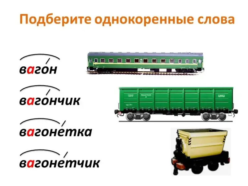 - Обратите внимание, как пишется слово вагон. Подберите к нему однокоренные слова. (Вагончик; вагонетка - небольшой вагон для перевозки грузов на узкоколейных дорогах; вагонетчик - рабочий, ведущий вагонетку; вагонный.) (СЛАЙД 15)