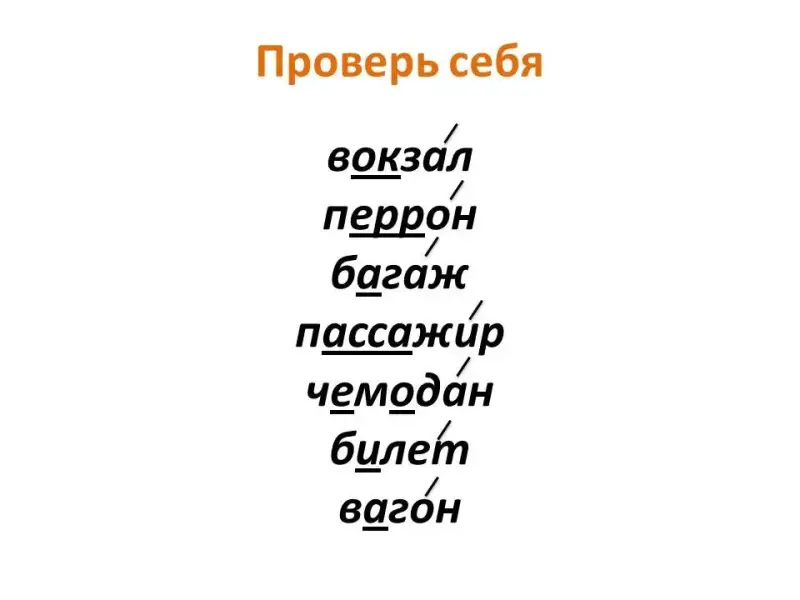 - Вспомните, какие слова вы назвали. (Вокзал, перрон, багаж, пассажир, чемодан, билет, вагон.) (СЛАЙД 16)