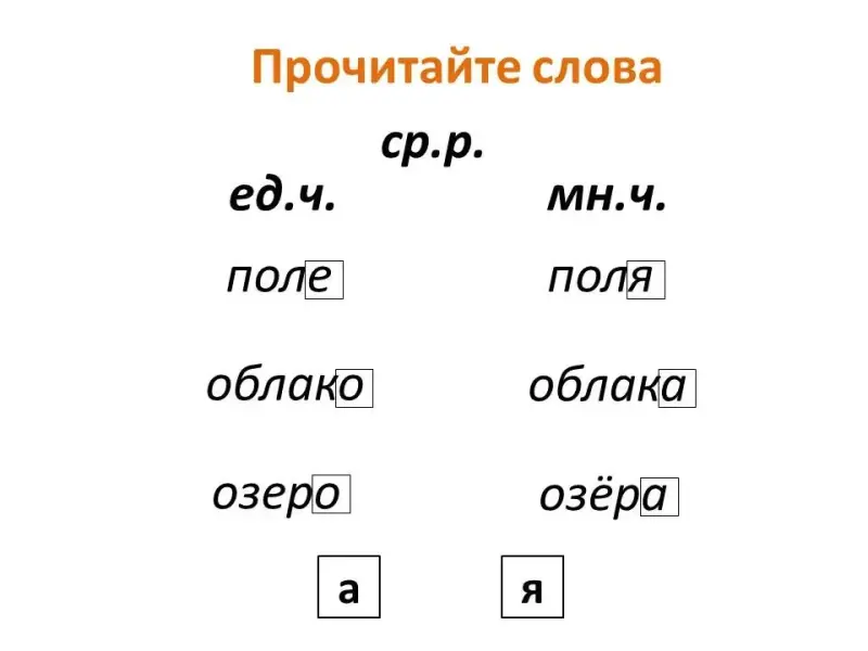Сделайте вывод: какие окончания могут быть у существительных среднего рода во множественном числе? (У существительных среднего рода во множественном числе окончания -а, -я.)