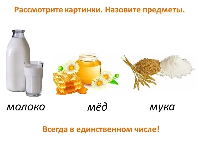 Имена существительные "молоко", "мед", "мука" всегда в единственном числе.