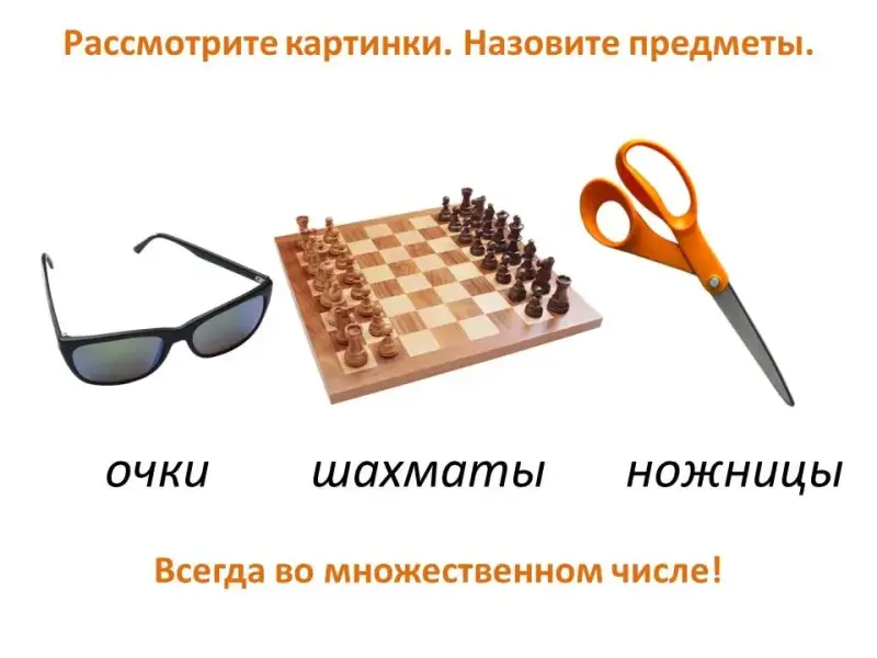 Назовите предметы. (Очки, шахматы, ножницы.) (СЛАЙД 30)