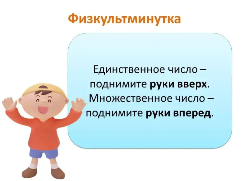 Я буду называть имена существительные единственного и множественного числа. Если произнесу существительное в единственном числе, вы поднимаете руки вверх. Если услышите существительное во множественном числе, руки вперед.