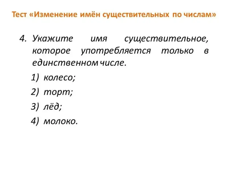 Укажите имя существительное в форме единственного числа (СЛАЙД 47):