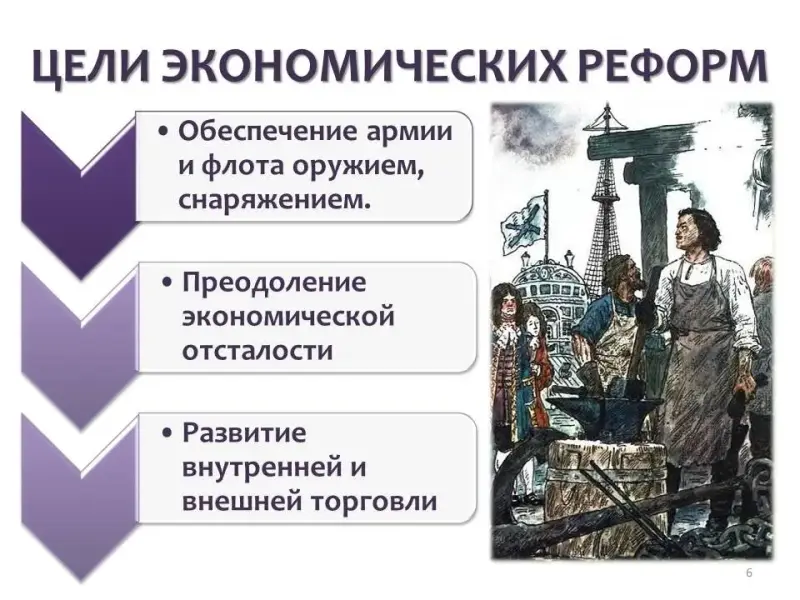 Цель: формирование представлений обучающихся о состоянии экономики в годы правления Петра I.