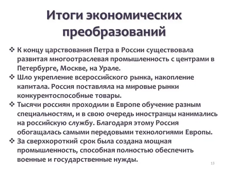 Вывод: Видя недостатки в экономике, Пётр перешёл к её преобразованию.