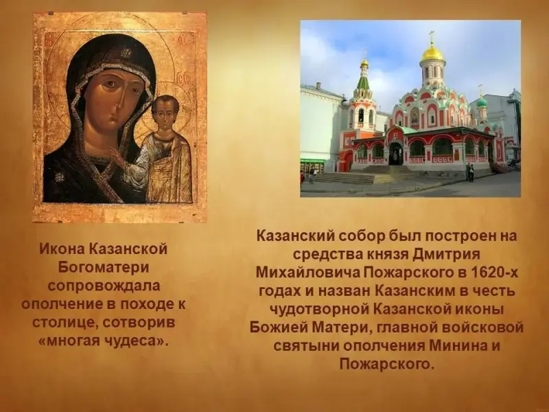 В это тяжёлое время копия (список) иконы Казанской Божьей Матери находилась у руководителя ополчения князя Д.М. Пожарского. Верующий народ связывал освобождение столицы от врага с молитвами перед этим чудотворным образом. Икона Казанской богоматери была духовным стимулом освобождения.