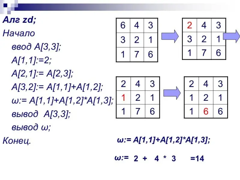 o:= А[1,1]+А[1,2] *А[1,3];