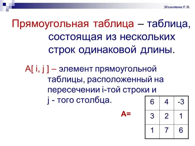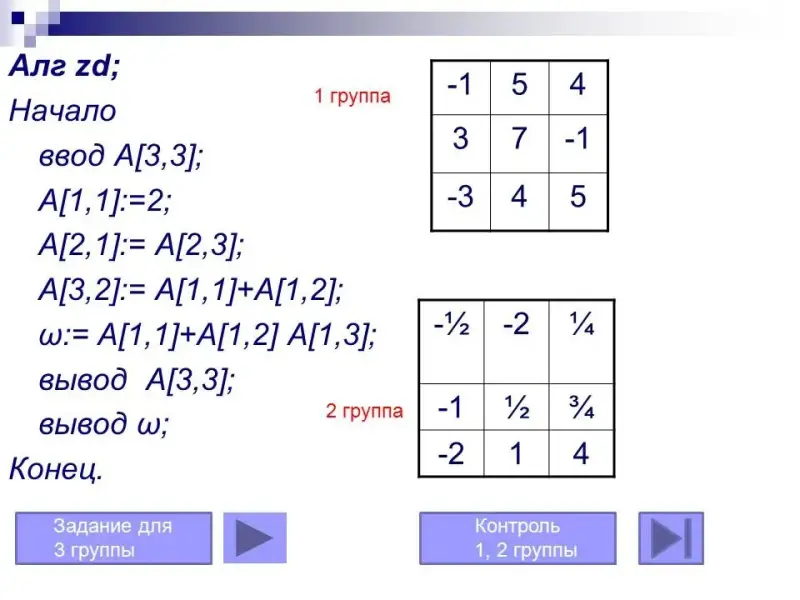 - контроль уровня сформированной теоретической базы: таблица (линейная, прямоугольная), размерность таблицы, правила обработки табличных элементов, правил индексации элементов таблиц;