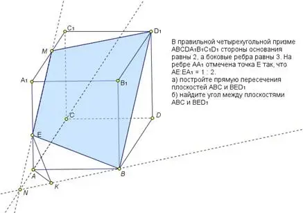 а) Построение отражено на рис. 15. Используя утверждение 6, для построения сечения через точку Eпроводим прямую, параллельную BD1. Она пересекает ребро A1C1 в точке M. Прямая ME пересекает прямую AC в точке N. Из утверждения 2 следует, что искомая прямая пересечения плоскостей - это прямая NB;